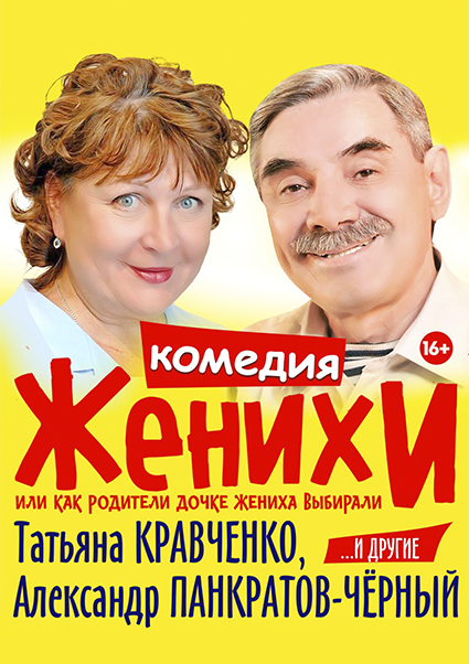Театральная постановка «Женихи» по пьесе «Как родители дочке жениха выбирали» порадует любителей комедий с участием звёзд театра и кино: впервые вместе на одной сцене Татьяна Кравченко и Александр Панкратов-Черный. Родители Кати (Татьяна Кравченко и Александр Панкратов-Черный) случайно узнают, что их любимая единственная дочь на шестом месяце… Как же так: дочь беременна, а мужа-то нет! И даже жениха не предвидится!!! Втайне от нее озадаченные родители начинают поиск достойной кандидатуры. Но они даже не подозревают насколько непросто в наше время найти не то что ДОСТОЙНОГО, А ХОТЬ КАКОГО-ТО ЖЕНИХА…