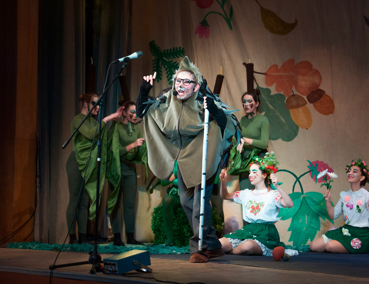 Первое действие происходит на полянке, где растут цветы, земляника, летают бабочки. На краю полянки находится болотце, где живут Лягушка и камыши. Неожиданно на полянке появляется озорная девочка Аленка, которую звери – благовоспитанный Ежик, поющий Гриб, мудрый Филин и даже сварливая Лягушка, учат вежливости и хорошим манерам.