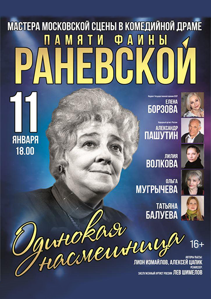 Мастера московской сцены в комедийной драме памяти Фаины Раневской. Смешная и грустная история в двух частях. Неповторимый, не придуманный авторами, а подлинный юмор Фаины Раневской, самые яркие её образы, самые смешные её анекдоты, самые меткие её афоризмы, самые трагикомические моменты её судьбы. Время действия — последний год жизни великой актрисы и человека. Место действия — её московская квартира. Вам будет весело, но…