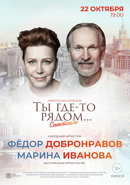 Продолжительность: 1 час 30 минут с антрактом Режиссер-постановщик - Владимир Большов Автор пьесы - Михаил Хейфец Сценограф - Борис Лысиков Художник по костюмам - Лада Шведова В ролях: • ОН - Фёдор Добронравов • ОНА - Марина Иванова Новый спектакль продюсерского центра «Федор Добронравов» «Ты где-то рядом» рассказывает лирическую историю любви немолодых людей. Зрителям на...