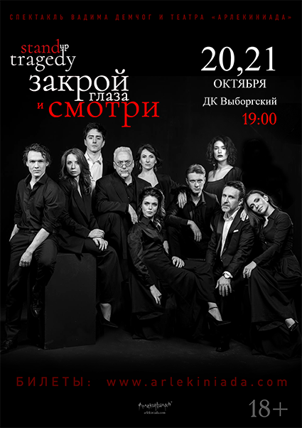 Продолжительность: 3 часа с антрактом Вадим Демчог и театр Арлекиниада представляет «Закрой глаза и смотри» — это игра живого слова и персонального восприятия каждого зрителя в отдельности. Актеры выходят на сцену и читают монологи от имени великих людей (и не только людей, впрочем!), а в голове каждого зрителя тем временем сам собой загорается экран «кинотеатра»....