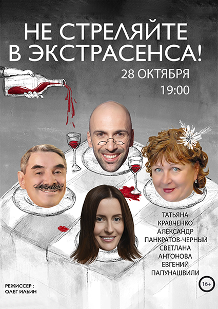 Продолжительность: 2 часа с антрактом Мистическая комедия Режиссер - Олег Ильин В ролях: • Татьяна Кравченко • Александр Панкратов-Черный / Дмитрий Мухамадеев • Евгений Папунаишвили • Светлана Антонова • Александра Солянкина • Анастасия Савицкая Преуспевающий бизнесмен решил посмеяться над потусторонним миром и пригласил на спиритический сеанс знаменитого медиума. Маг-шарлатан случайно вызвал дух его умершего родственника....