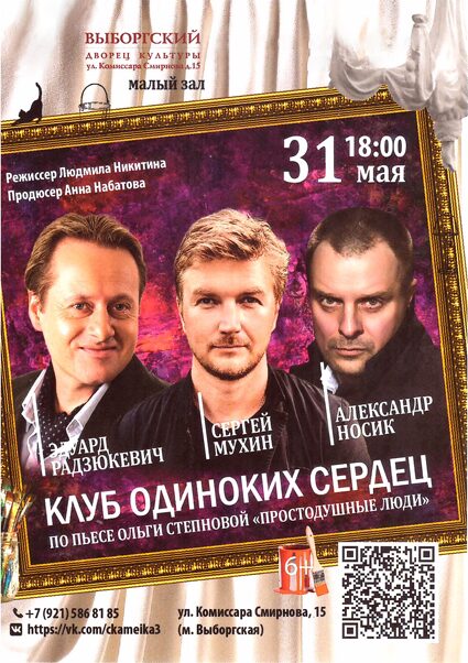 19:00 «Любовь — не картошка, не выбросишь в окошко» ДК «Выборгский» 7 мая 19:00 «Любовь — не картошка, не выбросишь в окошко» ДК «Выборгский»
